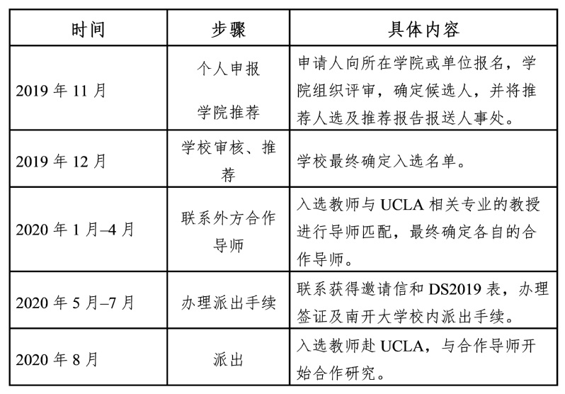 (1)申請人對照自身條件向所在學院或單位提出申請,并填寫提交《南開大學—美國加州大學洛杉磯分校項目申報表》(見附件一)。