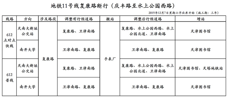 因復(fù)康路地鐵施工,自2019年12月7日起,612行車線路將有所調(diào)整,為期三年,具體安排如下: