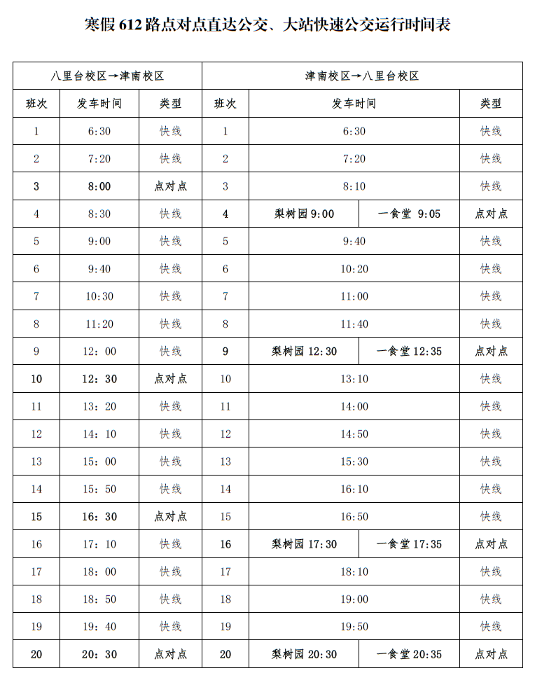 為滿足寒假期間津南校區值班人員及留校師生的出行需求,進一步做好交通通勤服務保障,接待服務中心積極與天津公交集團二公司進行協商,決定自2020年1月14日—2月14日(含周六、日及法定節假日)實行寒假運行方案,具體安排如下: