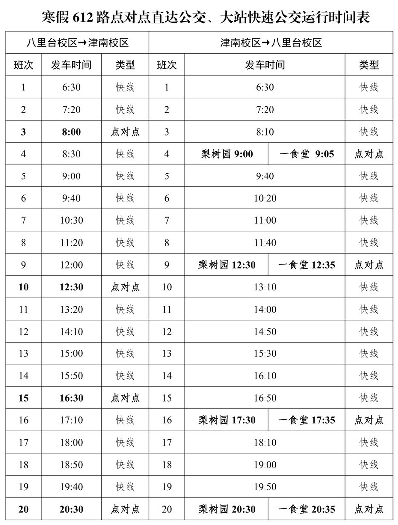泰達與八里臺、津南校區通勤班車1月10日至2月12日實行寒假運行方案,期間周六、周日,1月31日(除夕)至2月6日(正月初六)暫停運行,2月13日(周日)恢復正常工作日運行,具體安排如下: