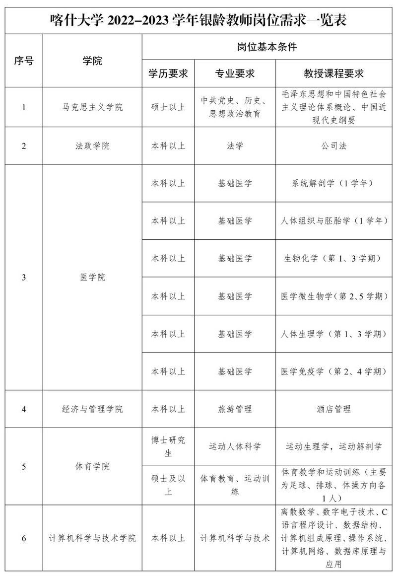在南開大學退休人員中遴選銀齡教師,申請教師年齡一般在70(含)歲以下(身體情況較好者可適當放寬年齡要求),具有副高級以上職稱,一線教學科研經驗豐富;政治可靠、師德高尚、愛崗敬業、業務精良;身體健康、甘于奉獻、不怕吃苦、作風扎實。在現有已派赴喀什大學銀齡教師的基礎上,增加3-5個派出名額。