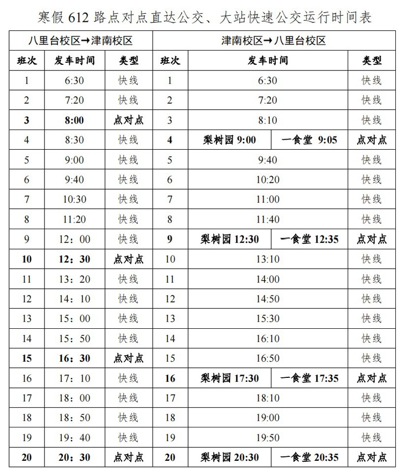 1月17日(周三)至2月17日(周六),泰達與八里臺、津南校區班車按照假期班車方案運行,2月18日(周日)恢復正常工作日運行。如遇臨時調整,另行通知。